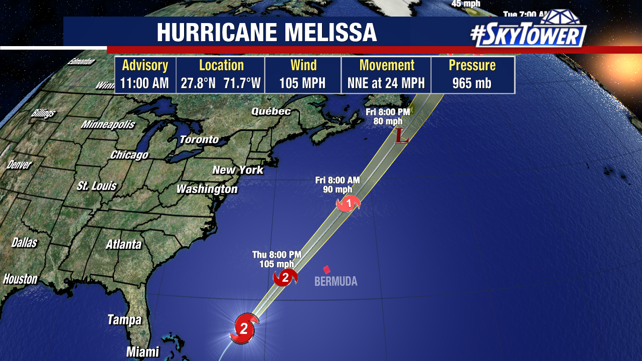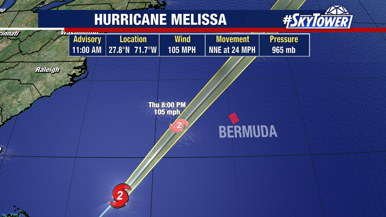 Hurricane Melissa is now a Category 2 hurricane that will pass Bermuda within the next 24 hours.