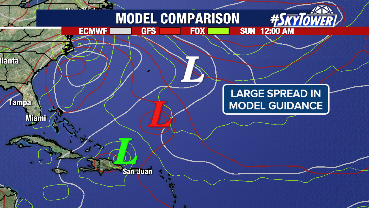 There is a large spread in models after it passes the islands. Some track Jerry through stronger wind shear while others lean towards a path offering more favorable winds for the storm.