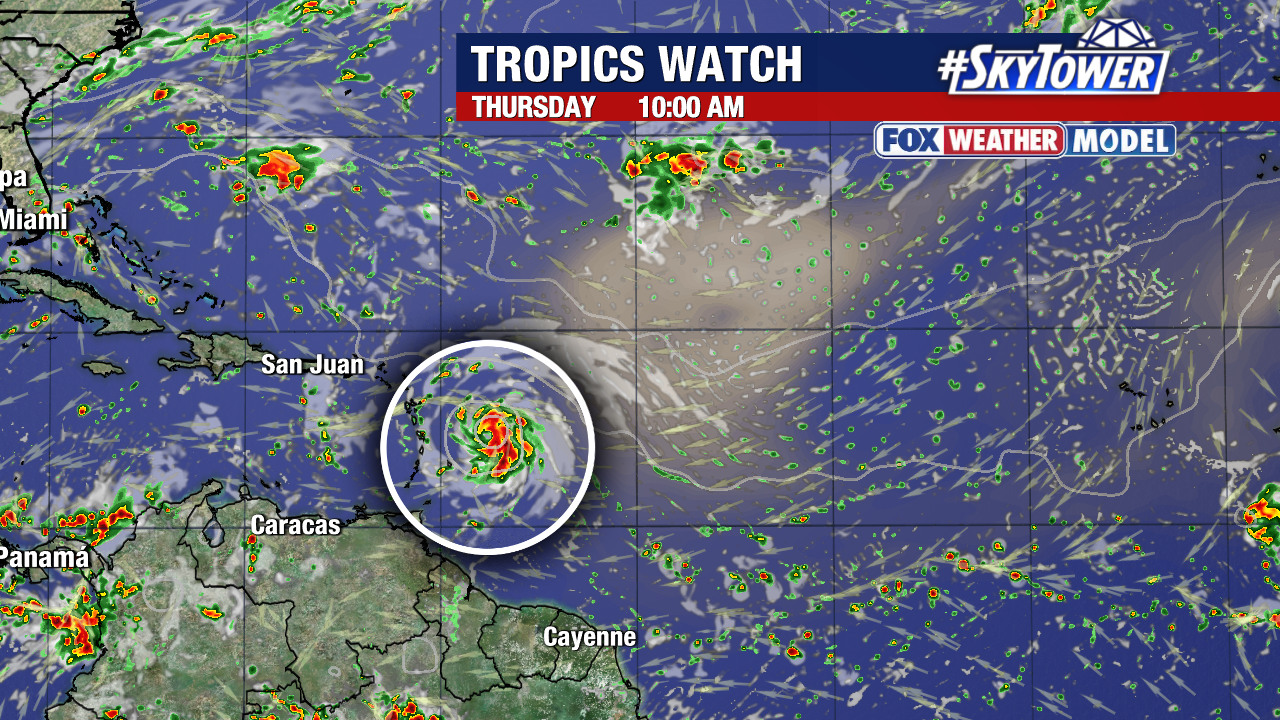 It will slow down a bit and it starts to turn more west-northwest in the next few days. Late this week and through the weekend, Jerry starts to curve north as a trough breaks down the ridge of high pressure.