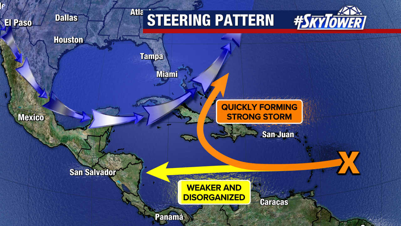 Today, the overwhelming majority of weather models keep the potential storm out of the Gulf. The two favored scenarios would be a track towards Central America, or an eventual turn north/northeast out of the Caribbean. It’s very early in the forecast process. We will not have a solid idea on its potential path until we see more agreement among weather models.