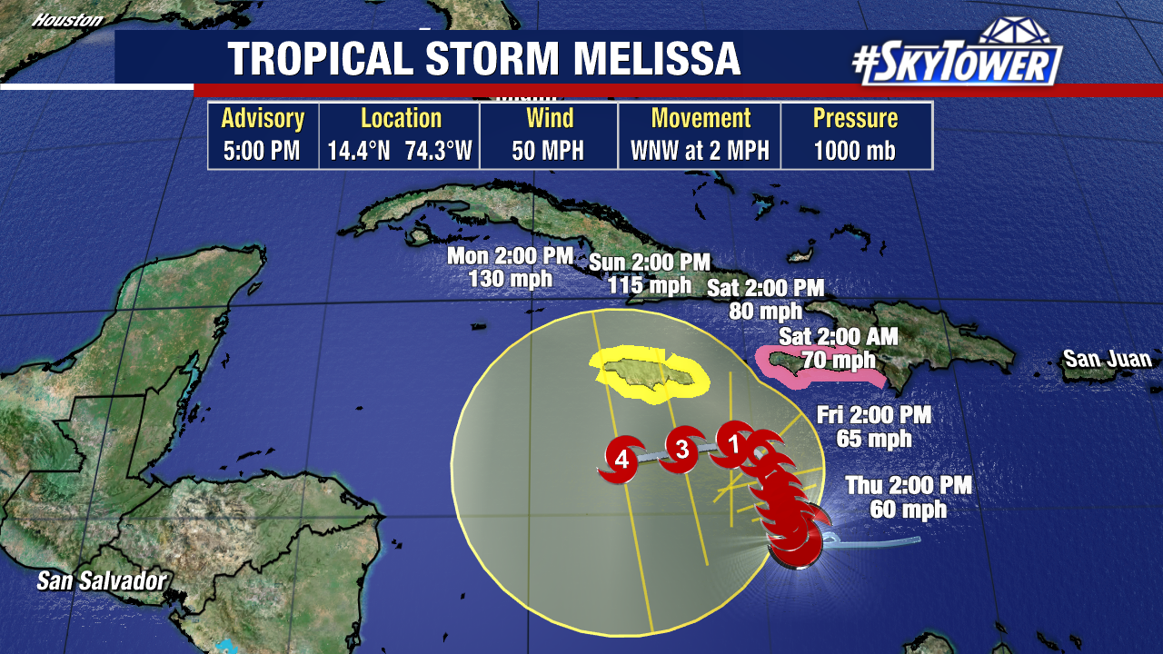 Tropical Storm Melissa is expected to strengthen into a hurricane in the Caribbean Sea by the end of this weekend. As you can tell by the cone, there is a wide range of places this storm may track over the next five days. Competing steering currents are tugging Melissa in different directions, keeping the track slow and uncertain in the short term.