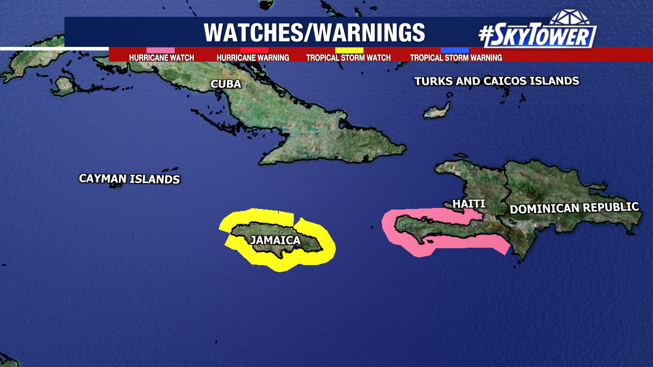 A Hurricane Watch is in effect for portions of Haiti and a Tropical Storm Watch is active for Jamaica.