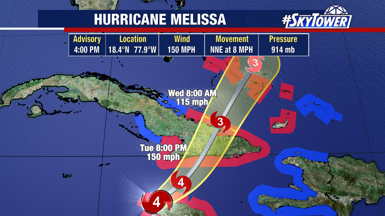 From here, Hurricane Melissa will make a second landfall in eastern Cuba late tonight – early Wednesday. The forecast still calls for a Category 4 with winds around 150 mph as it crosses Cuba’s southern coast.