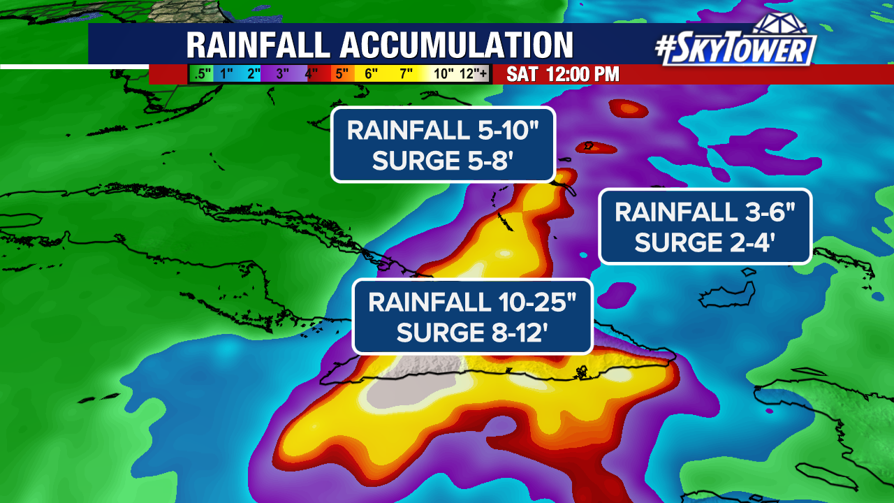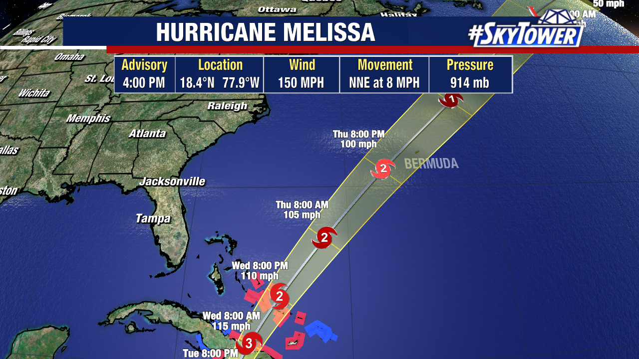 Impacts will be felt in the Turks and Caicos and the SE Bahamas on Wednesday as Melissa continues moving northeast at a faster clip. Thursday night into Friday, it passes near Bermuda with the forecast still calling for 100 mph winds.