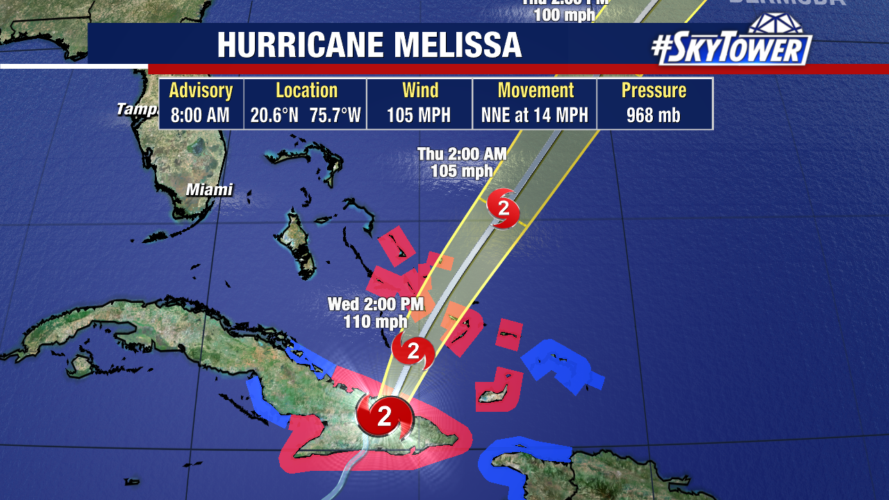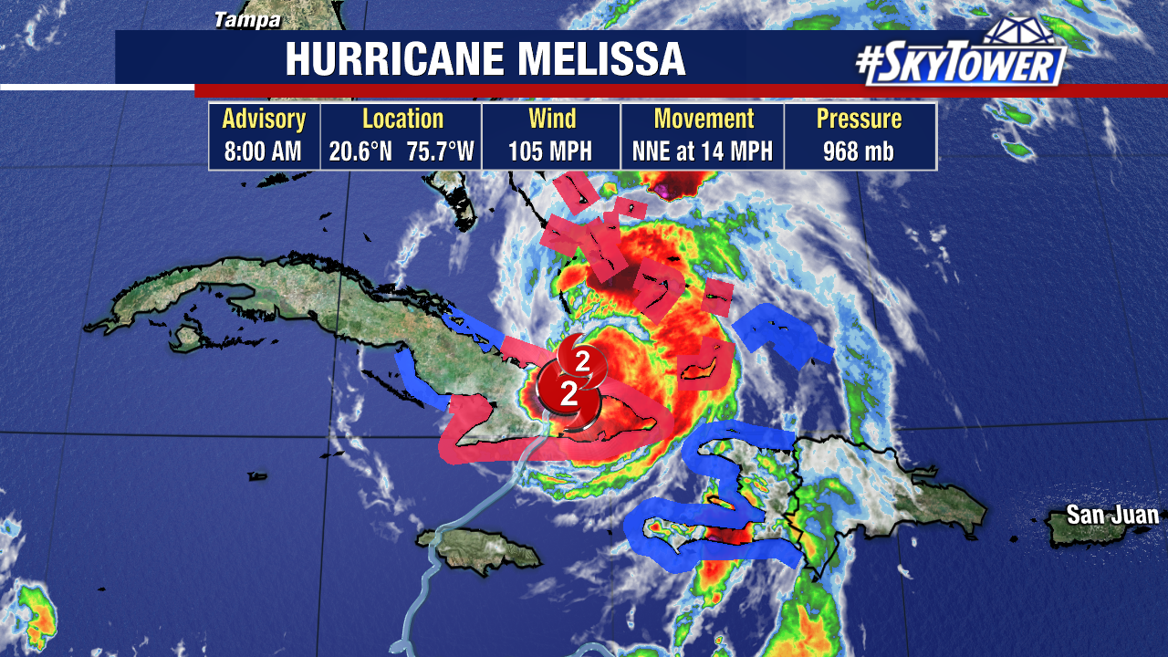 Melissa has been weakening while moving over eastern Cuba but is still at Category 2 strength.