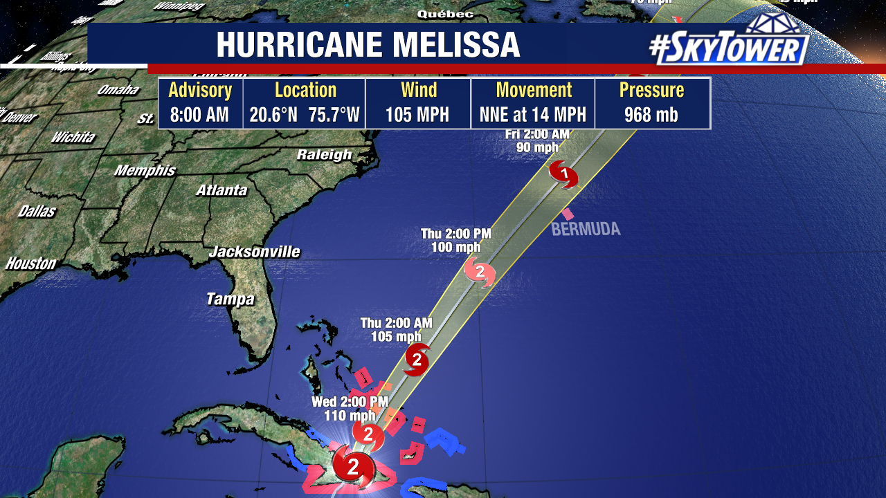 From there, Melissa will pass near Bermuda Thursday into Friday with heavy rain starting to affect Bermuda on Thursday.