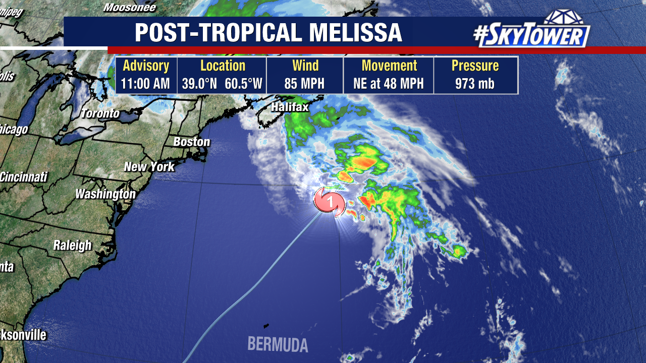 After passing west of Bermuda, Melissa has now become a post-tropical cyclone. Its now moving at a whopping 48 mph to the northeast. Wind gusts as strong as 98 mph were observed on Bermuda as the fast-moving hurricane moved by.
